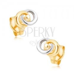 Fülbevaló 9K aranyból, ródiummal kezelt felülettel, két egymással összekapcsolt karikából, fehér és sárga aranyból, fényes, sima felülettel. A karikák között egy apró, csillogó golyó helyezkedik el. A hátsó oldal üreges. Biztonságos viselését stekker biztosítja. A fülbevaló méretei: 6 x 4 mmA fülbevaló súlya: 0,3 gFémjelzéssel ellátott. Az ár egy párra vonat