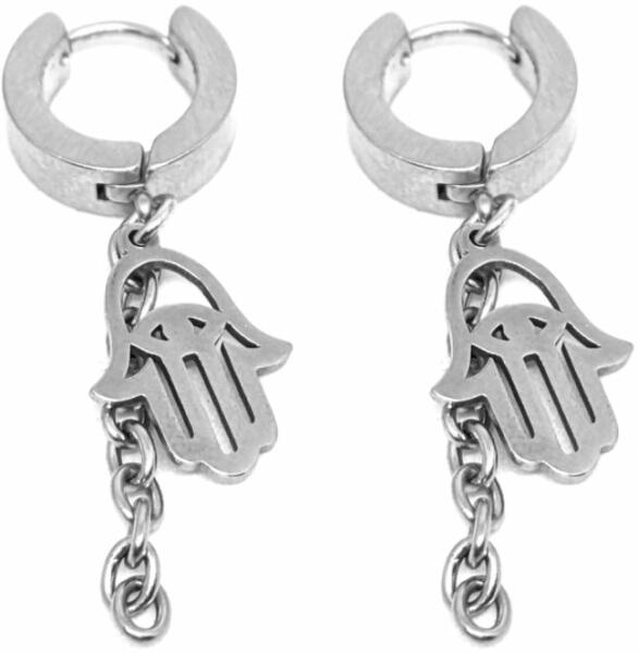 Nemesacél Fatima keze fülbevaló. Mérete kb. 4 cm. Paraméterek: Med ál mérete kb. 1,4 cm. Anyaga nemesacél. Akasztó rozsdamentes acél.