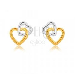 9K kombinált arany fülbevaló. Két szív alakzat amelyek összefonódnak egymással. A nagyobb szív sárga arannyal a kisebb pedig fehér arannyal van bevonva. A fülbevaló biztonságos viselését stekkeres zárszerkezet teszi lehetővé. Fülbevaló méretei: 6 x 6 mmFülbevaló súlya: 0,2 gFémjelzéssel ellátott. Az ár egy párra vonatkozik.
