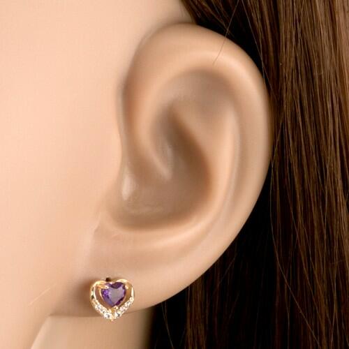375 arany fülbevaló, szimmetrikus szívecske körvonal alakban, amely apró, átlátszó cirkóniákkal díszített. A kontúr közepének felső részén csiszolt, szív alakú ametiszt található, lila árnyalatban. A fülbevaló stekker kapoccsal záródik. A fülbevaló méretei: 8 x 7 mmA fülbevaló súlya: 0,69 gFémjelzéssel ellátott. Az ár egy párra vonatkozik.