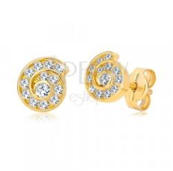 14K sárga arany fülbevaló tekeredett spirál alakzatú. A spirálban apró átlátszó cirkóniák vannak beültetve. A közepében egy nagyobb átlátszó csiszolt cirkónia található. A fülbevaló stekkeres zárszerkezettel rendelkezik. Fülbevaló méretei: 6 x 5 mmFülbevaló súlya: 0,6 gFémjelzéssel ellátott. Az ár egy párra vonatkozik.