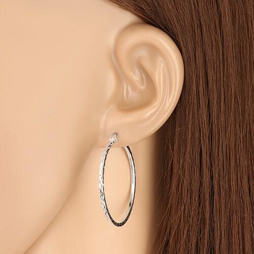 A 925 ezüst fülbevaló karika alakú. A keskeny karikákat sekély aszimmetrikus bemetszések díszítik az egész kerületén. A fülbevaló felülete fényes. A fülbevaló francia kapoccsal zárható, ahol a szár a vele szemben lévő villa alakú elembe illeszthető. Külső átmérő: 33 mmBelső átmérő: 30 mmSzélesség: 1,5 mmA fülbevaló súlya: 2,46 gAz ár egy párra vonatkozik. F