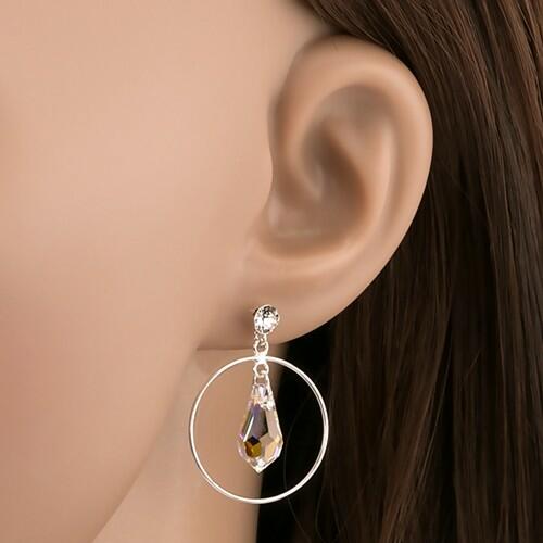 925 ezüst fülbevaló, amely stekkerrel viselhető, amelyet egy kör alakú átlátszó Swarovski kristály díszít, amelyen egy vékony karika függ egy nagyobb könnycsepp alakú kristállyal középen. A csepp felülete csiszolt és szivárványos visszfénnyel rendelkezik. Fülbevaló mérete: 22 x 29 mmSúly: 1,9 gFémjelzéssel ellátott. Az ár egy párra vonatkozik.