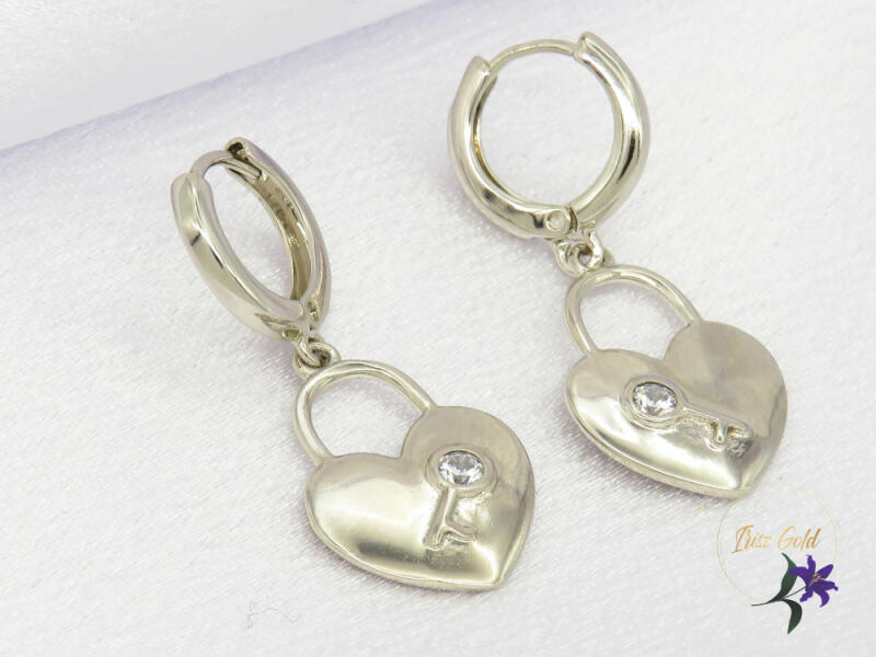 Antiallergén divatos fülbevaló kis szívecske benne egy kis kulcs pici cirkóna kővel Szin: rodium Méret: 30x12mm Zár: karika 10mm A forgalmazott divatékszerek alapanyaga nikkel és ólommentes ezért többnyire nem okoznak allergiás tüneteket, nyugodtan hordhatják fémérzékeny emberek is. Általában nem színezik a bőrt és más divatékszerekhez képest nagyságrendekkel jobb kopá