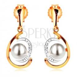 Az 585 arany fülbevalót egy vékony, fordított könnycsepp alkotja, amely alatt egy aszimmetrikus könnycsepp körvonala függ. A körvonal két ívből tevődik össze - a nagyobb, sárga arany ívnek fényes és sima felülete van és a kisebb, fehér arany ívet beültetett, átlátszó cirkóniák díszítik. A könnycsepp közepén egy édesvízi, tenyésztett, fehér színű gyöngy talá