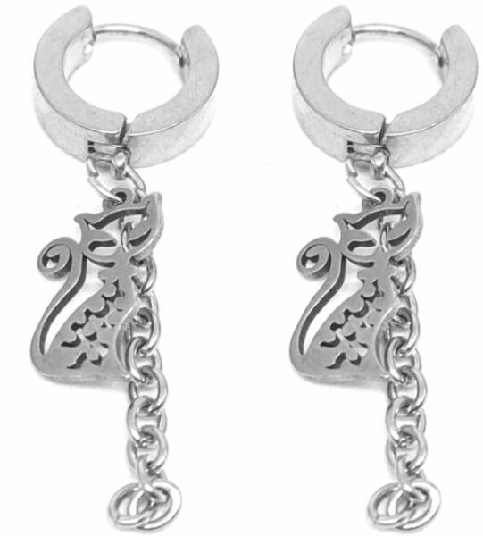 Cicás fülbevaló. Paraméterek: Mérete kb. 4 cm, cica kb. 1,5 cm. Rozsdamentes acél. A függő anyaga nemesacél, színe ezüst. Akasztó rozsdamentes acélból készült.