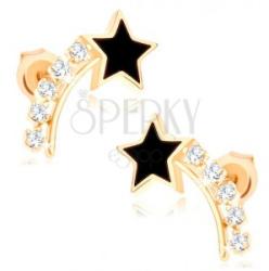 375 arany fülbevaló üstökös alakban, amelyet egy ötágú fekete fénymázas csillag alkot és egy csillogó farok két félhold formájában. Az egyik félhold fényes és sima felületű a másikat pedig egy átlátszó, kerek cirkóniákból álló vonal díszíti. Biztonságos viselését stekker biztosítja. A fülbevaló méretei: 6 x 14 mmA fülbevaló súlya: 0,9 gFémjelzéssel ellá