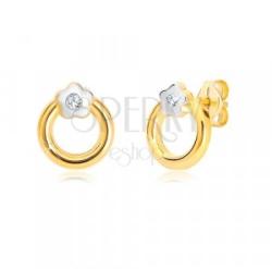 14K kombinált arany fülbevaló. Karika sárga aranyból, fehér arany virággal díszítve. A virág öt szirmú, középen egy kis cirkóniával. A felülete sima és fényes. Zárszerkezete stekkeres. Karika átmérője: 8 mmDísz rész mérete: 4 x 4 mmFülbevaló súlya: 0,5 gFémjelzéssel ellátott. Az ár egy párra vonatkozik.