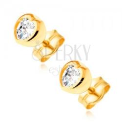 Arany beszúrós fülbevaló 585 kis szabályos szívvel, enyhén lekerekített fényes felszínnel, miközben a közepébe egy átlátszó cirkónia van beültetve. Biztonságos viselését stekker biztosítja. Méretek: 4 x 4 mm A fülbevaló súlya: 0,3 g Az ár egy párra vonatkozik. Fémjelzéssel ellátott.