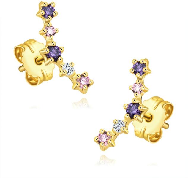 A 14K sárga arany fülbevaló ív alakú. Lila, rózsaszín és átlátszó árnyalatú, öt kerek cirkóniából álló sorral. A cirkóniákat négy vagy öt sima fogú foglalatban. A fülbevaló stekkerzárral rendelkezik. A fülbevaló méretei: 11 x 4 mmA fülbevaló súlya: 0,50 gFémjelzés – van. Az ár egy párra vonatkozik.