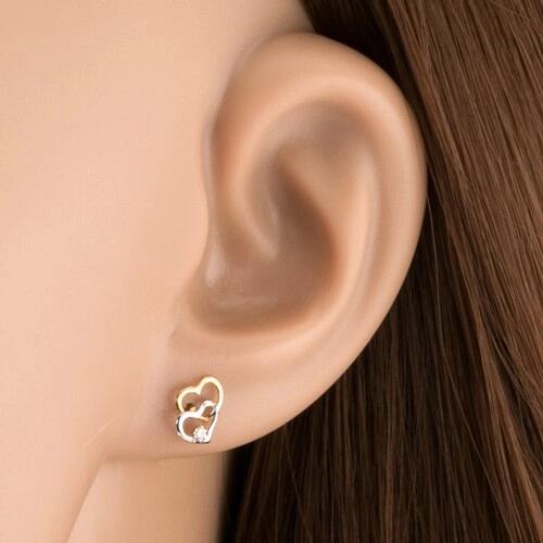 Fülbevaló 9K aranyból két egyforma szabályos szívköronalból. A kontúrok egymással összefonódnak és ferdén egymás alatt helyezkednek el. A fehér arany körvonalba apró átlátszó cirkónia van belehelyezve. A fülbevaló kapcsolása stekkeres. Fülbevaló mérete: 7 x 7 mmFülbevaló súlya: 0,40 gFémjelzéssel ellátott. Az ár egy párra vonatkozik. A ródiummal kezelt felület