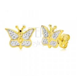 A 14K arany fülbevaló pillangó alakú, amelynek szárnyait apró kidomborodó pontok díszítik és közepét fehér arany réteg fedi. A szárnyak szélei és a pillangó teste sárga aranyból van. Biztonságos viselését stekker teszi lehetővé. Fülbevaló méretei: 10 x 8 mmFülbevaló súlya: 0,4 gFémjelzéssel ellátott. Az ár egy párra vonatkozik.