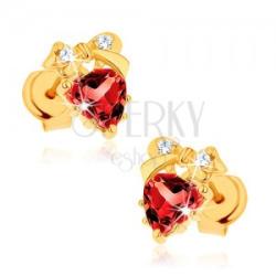 Fülbevaló 14K sárga aranyból csillogó, piros gránáttal szív alakra csiszolva, amely felett egy masni helyezkedik el apró, átlátszó cirkóniákkal díszítve. Biztonságos viselését stekker biztosítja. A fülbevaló méretei: 6 x 7 mmA fülbevaló súlya: 0,7 gFémjelzéssel ellátott. Az ár egy párra vonatkozik.