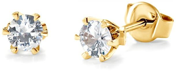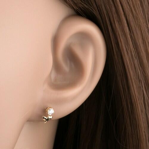Fülbevaló 14K sárga aranyból kis virág alakban, mely kerek átlátszó csillogó és csiszolt cirkóniával díszített. A cirkónia alatt enyhén ívelt szár található két fényes levélkével az oldalain. A fülbevaló kapcsolása stekkeres. Fülbevaló mérete: 5 x 8 mmSúlya: 0,4 gFémjelzéssel ellátott. Az ár egy párra vonatkozik.