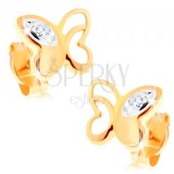 14K sárga arany fülbevaló kis pillangó alakban, amely szárnya az egyik oldalon díszes vágatos. A másik oldalon a felső részen cirkónia helyezkedik el átlátszó változatban. A pillangó hátsó része tömör. Biztonságos viselését stekker teszi lehetővé. Méret: 7 x 6 mmSúly: 0,4 gFémjelzéssel ellátott. Az ár egy párra vonatkozik.