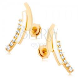 Fülbevaló 9K sárga aranyból három ívvel. Az első ív átlátszó cirkóniákkal van kirakva, a másodikat fehér fénymáz borít és a harmadiknak sima és fényes a felszíne. A fülbevaló kapcsolása stekkeres. Fülbevaló mérete: 5 x 15 mmFülbevaló súlya: 0,7 gFémjelzéssel ellátott. Az ár egy párra vonatkozik.