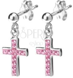 925 ezüstből készült bedugós fülbevaló függővel. A fülbevaló feje egyszerű gömböcske, amihez kis karika segítségével van erősítve a kereszt alakú függő. A függő egyik oldalát rózsaszín anyag tölti ki, ebbe vannak ágyazva a gömbölyű, rózsaszín cirkonkövek. A kereszt mérete: 7 x 11 mmTeljes méret: 7 x 15 mmA fülbevaló súlya: 1,05 gAz ár egy párra vonatkozik.