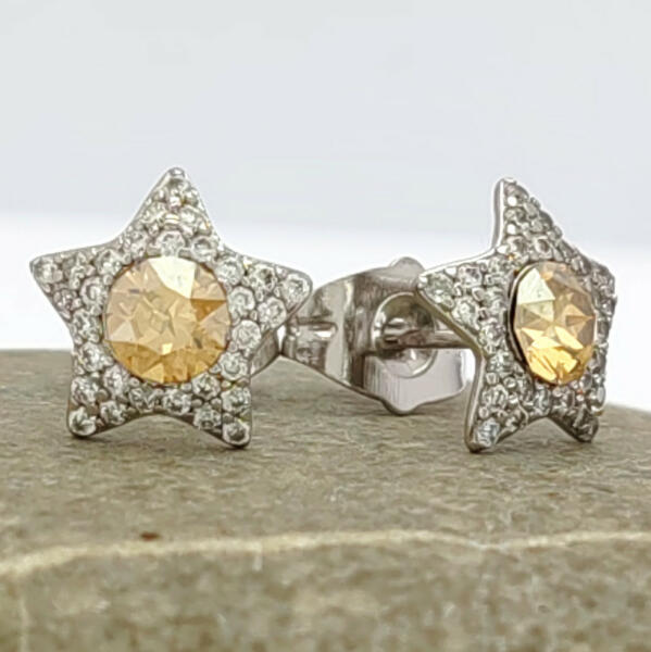 Csillogó napsárga Swarovski kristállyal díszített csillag formájú ezüstszínű fülbevaló. A tökéletes csillogásról sok apró, fehér kristály gondoskodik. A kristályok ragasztott, karmos foglalatban helyezkednek el. Időtálló ékszer, nem kopik, víz hatására nem feketedik. Antiallergén ékszer. Fülbevaló átmérője: 10 mm. Az antiallergén ékszerek olyan fémötvözetből
