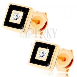 Bedugós fülbevaló 14K sárga aranyból négyzet alakban, amely közepébe egy csillogó, kerek, átlátszó cirkónia van ültetve. A négyzetet egy feltűnő kontúr díszíti fekete fénymázzal. Biztonságos viselését stekker biztosítja. A fülbevaló méretei: 5 x 5 mmA fülbevaló súlya: 0,6 gFémjelzéssel ellátott. Az ár egy párra vonatkozik. .