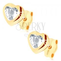 375 arany fülbevaló átlátszó cirkóniával szimmetrikus szív alakra csiszolva és egy tükörfényes foglalatba ültetve, amely a cirkónia körül egy csillogó keretet alkot. Biztonságos viselését stekker biztosítja. A fülbevaló méretei: 5,5 x 5,5 mmA fülbevaló súlya: 0,5 gFémjelzéssel ellátott. Az ár egy párra vonatkozik.