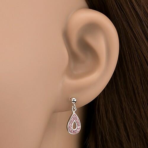 Ezüst bedugós fülbevaló fényes golyócska alakú fejjel, melyhez karikák segítségével, egy üreges könnycsepp alakú függő van fogatva. A medál felülete rózsaszín és beágyazott rózsaszín kövekkel díszített. Biztonságos viselését a stekker biztosítja. A könnycsepp méretei: 6 x 10 mmTeljes méret: 6 x 15 mmA fülbevaló súlya: 1,28 gAz ár egy párra vonatkozik. Fémjel