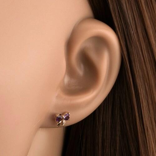 Fülbevaló 14K sárga aranyból lila masni alakban, amelyet két, csillogó, csiszolt szív alkot ametisztből. A masni alatt két lógó szalag található, miközben az egyik átlátszó cirkóniákkal díszített, a másik pedig sima. Biztonságos viselését stekker biztosítja. A fülbevaló méretei: 6 x 6 mmA fülbevaló súlya: 0,66 gFémjelzéssel ellátott. Az ár egy párra vonatkozik.
