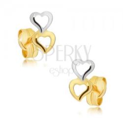 Arany beszúrós fülbevaló két szabálytalan szívkörvonalból mely egymás felett van elhelyezve, miközben az egyik fehér aranyból készült, a másik sárga aranyból. A szívek felszíne fényes és enyhén lekerekített. Biztonságos viselését stekker biztosítja. A fülbevaló méretei: 4 x 7 mmA fülbevaló súlya: 0,4 gFémjelzéssel ellátott. Az ár egy párra vonatkozik.