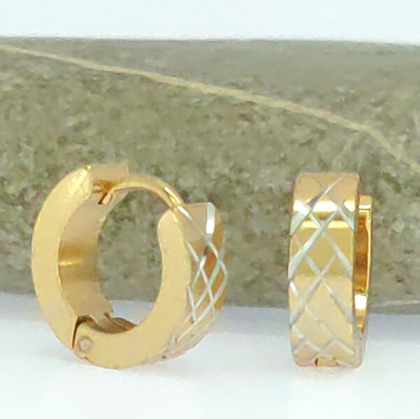 Aranyszínű nemesacél ( 316L ) karika fülbevaló, melyet metszett minta díszít. Időtálló darab, nem feketedik, nem kopik, nem színezi a bőrt. Antiallergén ékszer. 14K arany színben kapható. Belső átmérője: 9 mm. Fülbevaló szélessége: 4 mm. A nemesacél ékszerek rendkívül népszerűek kedvező tulajdonságaik miatt. A nemesacél semmilyen nikkelsót nem bocsájt ki magábó