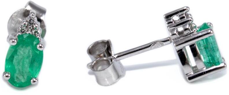Modern stílusú, kedvelt fazonú, gyémánttal és smaragddal ékített, karmos foglalatú, ródiummal bevont fehérarany fülbevaló.