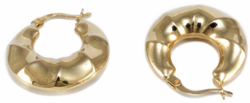 Klasszikus és kedvelt fazonú, igen mutatós, üreges kialakítású, középre szélesedő arany karika fülbevaló.