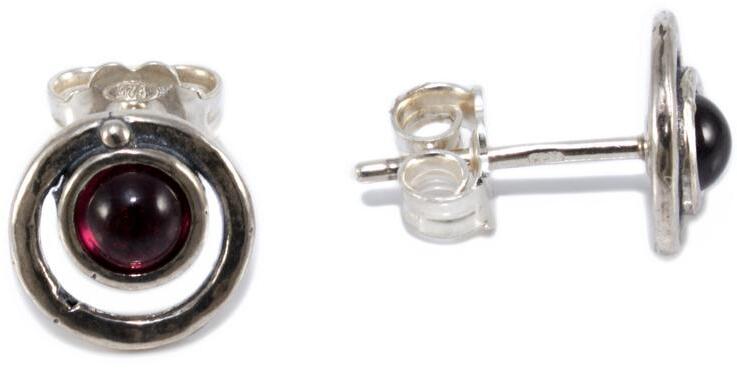 Kedvelt fazonú, kör alakú, antikolással és gránáttal díszített bedugós ezüst fülbevaló.