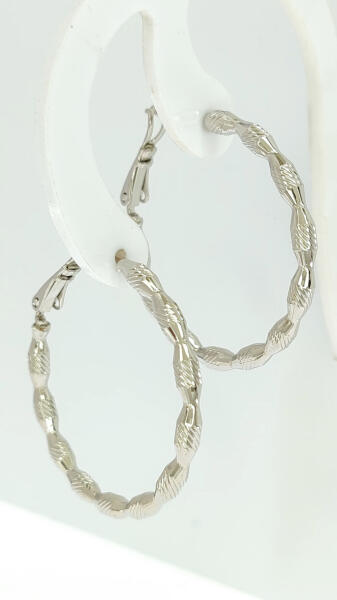 Ezüstszínű karika fülbevaló, melyet metszett minta díszít. Időtálló darab, nem kopik, nem feketedik, nem színezi a bőrt. Antiallergén ékszer, nem okoz panaszokat fémérzékeny hölgyeknek sem. Fülbevaló belső átmérője: 31 mm. Fülbevaló szélessége: 3 mm. Az antiallergén ékszerek olyan fémötvözetből készülnek, melyek nem irritálják a bőrt, nem okoznak allergiás r