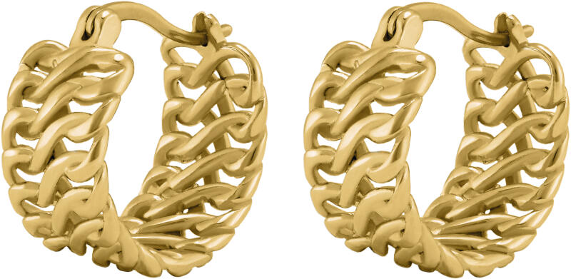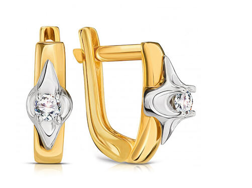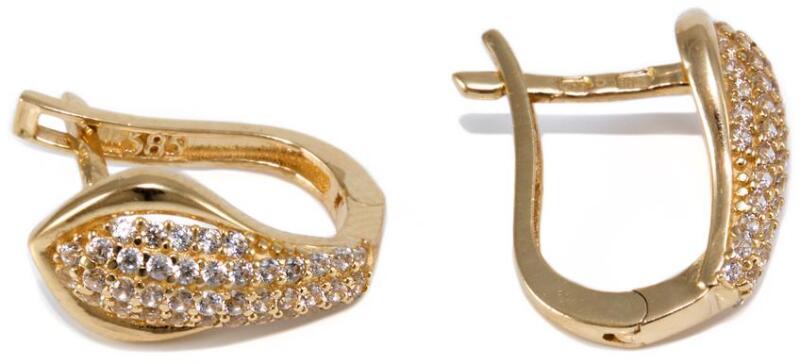 Modern stílusú, csillogó cirkónia kövekkel ékített, masszív kialakítású arany fülbevaló.