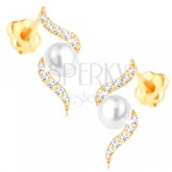A gyémánt fülbevaló 14K sárga aranyból spirális alakú, amelybe tíz apró átlátszó gyémánt van beültetve. A spirális közepét fehér színű gömbölyű szintetikus gyöngy díszíti. Biztonságos viselését stekker teszi lehetővé. Fülbevaló méretei: 6 x 13 mmGyöngy átmérője: 4 mmEgy gyémánt átmérője: 1 mmGyémántok teljes súlya: 0,1 ctTisztaság: SISzín: H-IFülb