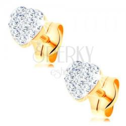 585 arany fülbevaló kis szívvel, átlátszó csillogó Swarovski kristályokkal gazdagon kirakva. A kristályok fehér anyaggal kitöltött részbe vannak beültetve, mely a szívet fedi. A fülbevaló kapcsolása stekkeres. A fülbevaló méretei: 4 x 4 mmSúly: 0,3 gFémjelzéssel ellátott. Az ár egy párra vonatkozik.