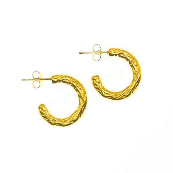 Hipoallergén és vízálló karika fülbevaló, kalapált stílussal ötvözve. Rendeltetésszerű használat mellett, színét és fényességét évekig megtartja. Fülbevaló mérete: 3,6x20,5 mm