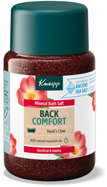 Átmelegíti az izmokat, segít az ellazulásban, egy jóleső fürdő a hátnak, a vállaknak és a nyaknak. Könnyen oldódó kristályok természetes termálsóval*. A készítmény az értékes ördögcsáklya kivonatát tartalmazza, amelyet a kozmetika a sporttevékenységek utáni lazító ápoláshoz használ és természetes éterikus kajeputfa-olajat tartalmaz. A Kneipp fürdősók termé