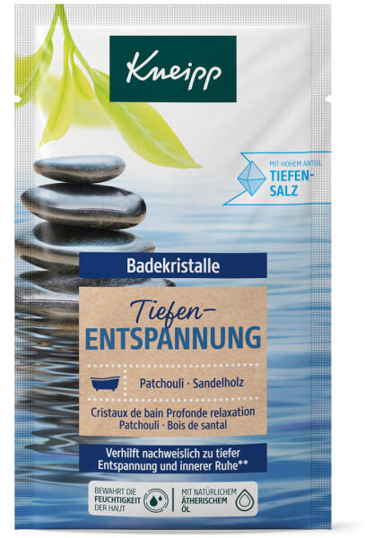 "Mélyrelaxáló" fürdősó. A Kneipp Mélyrelaxáló fürdőkristály természetes pacsuli olajat és értékes szantálfa kivonatot tartalmaz. A természetes olajok hatása révén segíti a mély pihenést és megteremti a belső békét. Alkalmazás: A tasak feltépése után, öntsd a fürdőkristályt a 36-38 fokos fürdővízbe és várj, amíg teljesen feloldódik! Az optimális hatás el