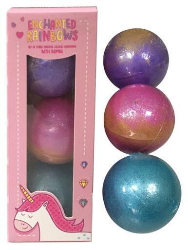 Fürdőgolyó Szett, 3 db-os - Unikornis Elvarázsolt szivárvány ( Marcipán, Vörös-áfonya, Vattacukor ) A fürdőbomba /fürdógolyó/ szett, 3 db-os - Unikornis Elvarázsolt szivárvány elsősorban gyerekeknek készített fürdőgolyó / fürdőbomba! De nyugodtan lehet ajándékozni mindenkinek aki kedveli az ádes illatokat! A fürőbomba / fürdőgolyó illatai: Marcipán, Vörös-áfon
