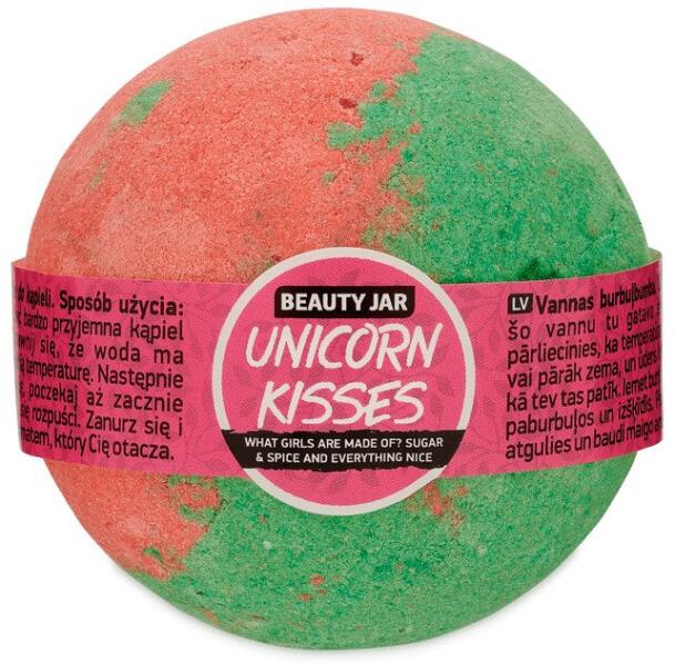 Pezsgő fürdőlabda E-vitaminnal és eperrel, Unicorn Kisses, Beauty Jar, 150g Fürdőlabda természetes eper illattal, mandulaolajjal és E-vitaminnal narancssárga és zöld színben, mely finom árnyalatot kölcsönöz a víznek. Az epernek nemcsak ellenállhatatlan íze van, hanem antioxidáns tulajdonságai is. Eltüntetik a pigmentfoltokat és tonizálják a bőrt, míg a rebarbara C-vitami