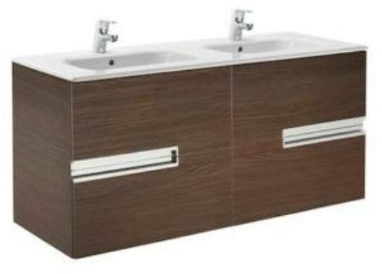 Roca Victoria-N Unik alsószekrény és dupla mosdóval wenge A855830154 Méret: 120x46x56,5 cm 4 fékezett záródású fiók Dupla kerámia mosdó, csaplyukkal túlfolyóval Opcionálisan rendelhető: bútorláb, törölközőtartó Csaptelep és leeresztő nélkül