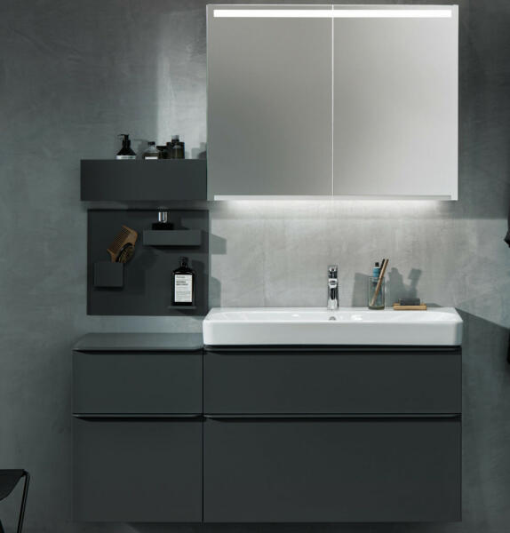 Laufen Pro S mosdó alsószekrénnyel 80x50 cm, grafit H8619634801041 2 fiókos szekrény Kerámia mosdó, egy csaplyukkal, túlfolyóval Csaptelep és szifon nélkül! Opcióként rendelhető törölköző tartó a szekrény oldalára