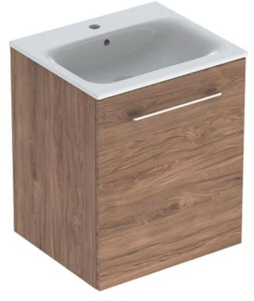 Geberit Selnova Square mosdószekrény, keskeny peremű mosdóval, egy ajtós, Feketedió hickory/Melaminos faszerkezet 501.250. 00.1 Tulajdonságok: Falra szerelhető Keskeny perem Egy ajtóval Egy rögzített polccal Fogantyú a nyitáshoz Ajtó csillapítómechanizmussal Nagy tömörségű, háromrétegű farostlemezből készült mosdóalsószekrény Ütközőoldal bal vagy jobb Nedvességtűr