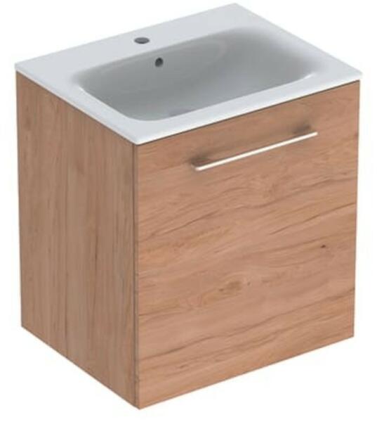 Geberit Selnova Square mosdószekrény, keskeny peremű mosdóval, egy ajtós, Feketedió hickory világos/Melaminos faszerkezet 501.255. 00.1 Tulajdonságok: Falra szerelhető Keskeny perem Egy ajtóval Egy rögzített polccal Fogantyú a nyitáshoz Ajtó csillapítómechanizmussal Nagy tömörségű, háromrétegű farostlemezből készült mosdóalsószekrény Ütközőoldal bal vagy jobb Nedve