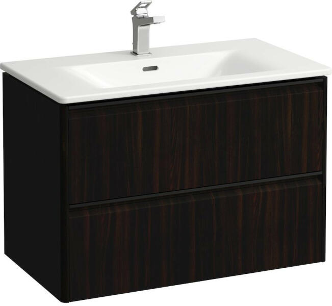 Laufen Palace 2 fiókos alsószekrény mosdóval 80x45 cm, sötétbarna szil H8617052631041 Szerelés: falra Mosdó méret: 80x45 cm Szekrény méret: 78,3x43,8 cm Teljes magasság: 54,5 cm Vékony mosdó alsószekrénnyel Mosdó alapanyaga: kerémia 1 Csaplyukkal 2 fiókkal Soft Closing rendszerrel, fiók rendezővel Fekete alumínium fogantyúval Hagyományos és helytakarékos szifonnal is szer