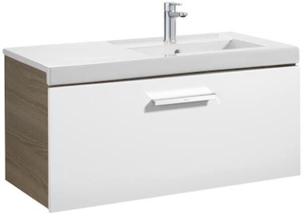 Roca Unik Prisma 1 fiókos alsószekrény jobbos mosdóval 900 kőris fehér A855947322 Telepítés: falra függesztve Anyag: MDF/laminált Szélesség: 900 mm Mélység: 460 mm Magasság: 450 mm Kivitel: 1 fiókkal Mosdó anyaga: porcelán Mosdó jobb oldalon Pakolófelület bal oldalon Mosdó mérete: 90x45x13 cm 1 nyitott csapfurattal Szín: kőris/fehér A csaptelep nem tartozék.