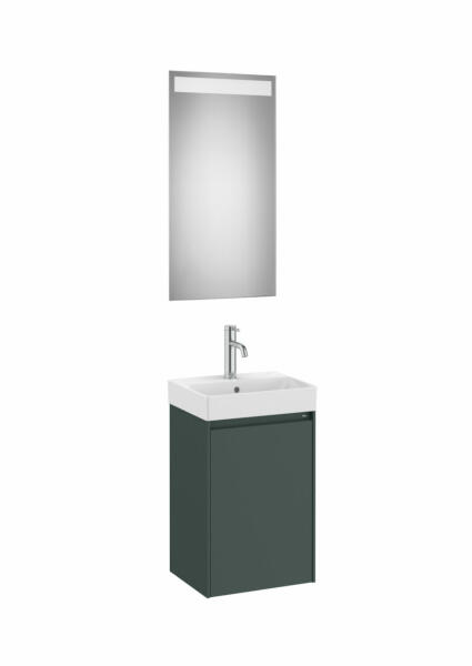 Roca Ona Pack mosdószekrény mosdóval és tükör LED világítással matt zöld A851695513 Alsószekrény tulajdonságai: Gar ancia: 2 év Telepítés: falra Magasság: 565 mm Magasság mosdóval: 645 mm Szélesség: 385 mm Szélesség mosdóval: 400 mm Mélység: 320 mm Kivitel: 1 ajtós, lágy záródás Nyitási mód: jobbos vagy balos szerelés Szín: matt zöld Mosdó tulajdonságai: Garan
