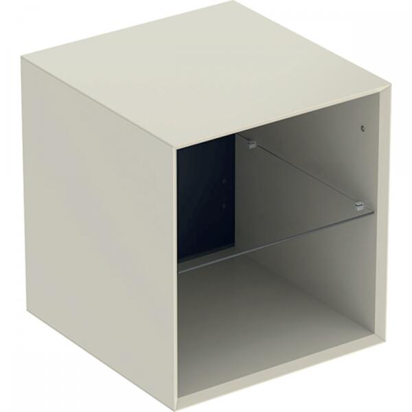 Geberit ONE oldalsó polcelem, 45x49.2x47cm, homokszürke / fényes bevonat 505.079. 00.4 Tulajdonságok FSC C134279 tanúsítvánnyal Falra szerelhető Üvegpolccal Nedvességtűrő Előszerelve szállított Műszaki adatok Alapanyag Nagy tömörségű háromrétegű faro