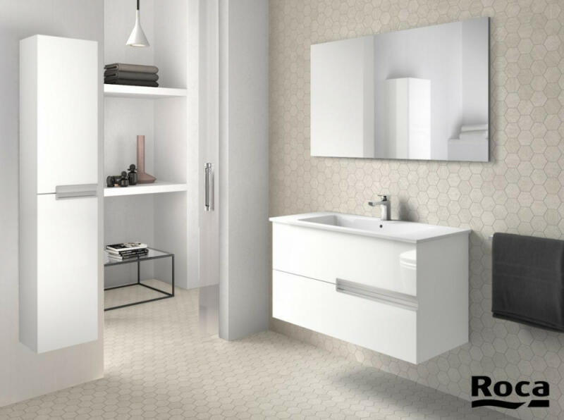 Roca Victoria-N Unik alsószekrény mosdóval 100 cm magasfényű fehér A855831806 Méret: 100x46x56,5 cm 2 fékezett záródású fiók Kerámia mosdó, csaplyukkal, túlfolyóval Opcionálisan rendelhető: bútorláb, törölközőtartó Csaptelep és leeresztő nélk