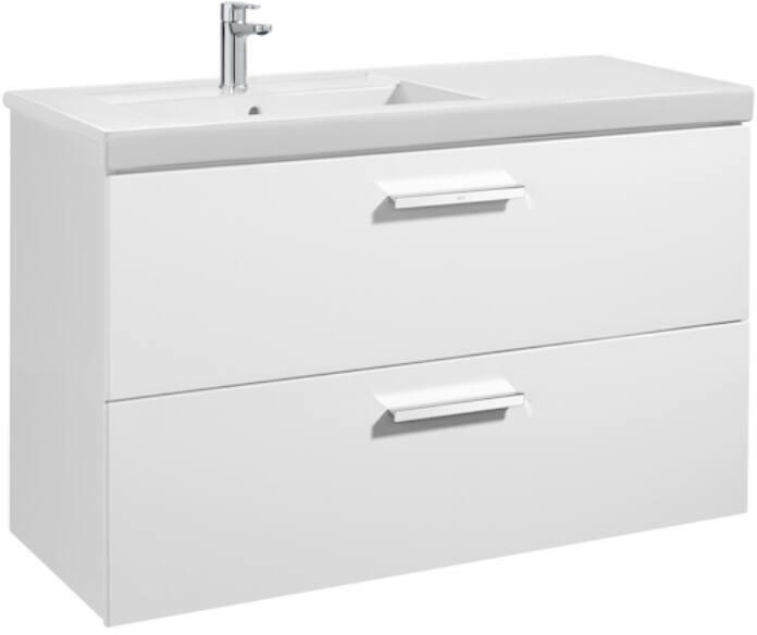 Roca Unik Prisma 2 fiókos alsószekrény balos mosdóval 1100 fehér A855955806 Telepítés: falra függesztve Anyag: MDF/laminált Szélesség: 1100 mm Mélység: 460 mm Magasság: 694 mm Kivitel: 2 fiókkal Mosdó anyaga: porcelán Medence bal oldalon Pakolófelület jobb oldalon Mosdó mérete: 110x45x13 cm 1 nyitott csapfurattal Szín: fehér Kiegészíthető lábbal és törölközőtartóva